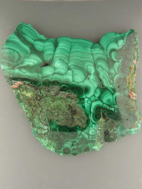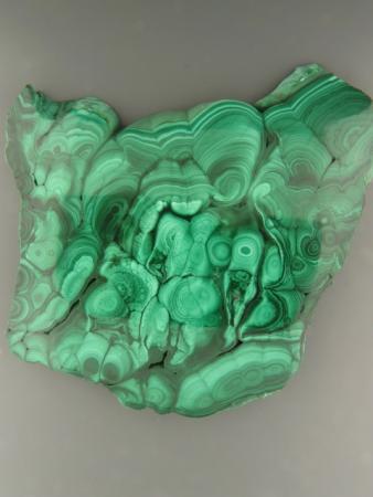 A polished slab of Malachite showing multiple bands and patterns.