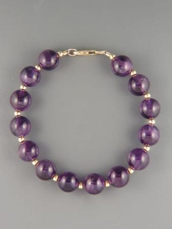 This bracelet features round, smooth polished Amethyt beads with 3mm round Gold beads.