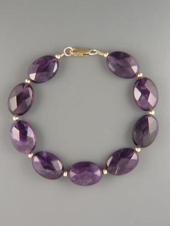 A bracelet featuring oval faceted Amethyst stones with gold beads.