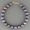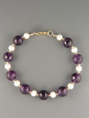 This bracelet features round, faceted Amethyst stones with white Pacific Pearls and Gold beads.