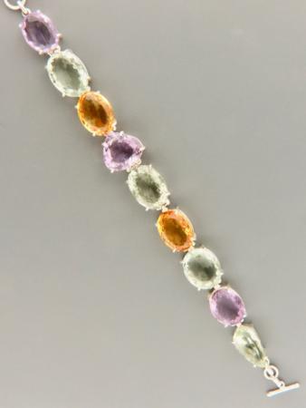 This Sterling Silver link bracelet features nine large, faceted Amethyst, Citrine and Green Amethyst (Prasiolite) stones.