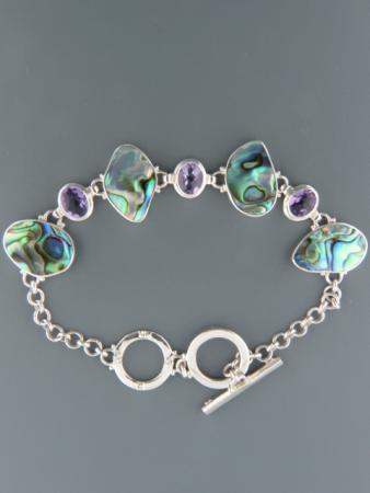 This Sterling Silver bracelet features irregular shaped New Zealand Paua Shell pieces with oval faceted Amethyst stones.