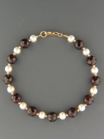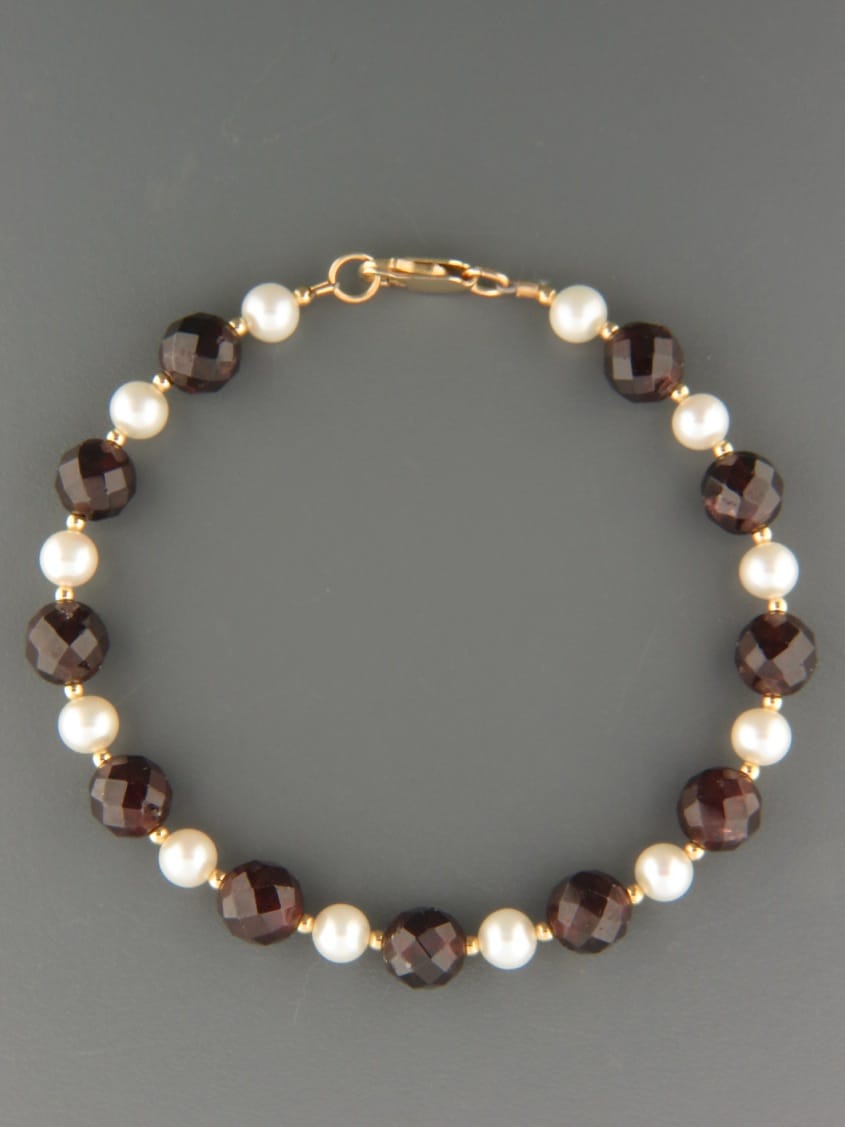 This bracelet features faceted Garnet stones and Pacific Pearls with 2mm round Gold beads.