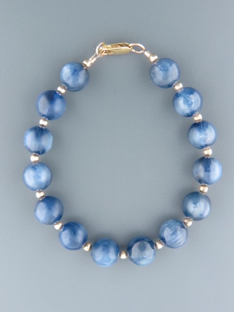 This bracelet features great quality Kyanite stone beads showing good chatoyancy with 3mm round Gold beads.