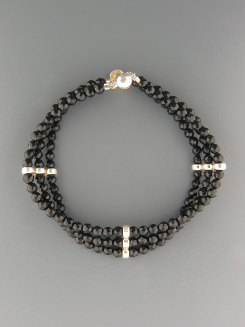 A three strand Onyx bracelet with Sterling Silver magnetic clasp and spacers.
