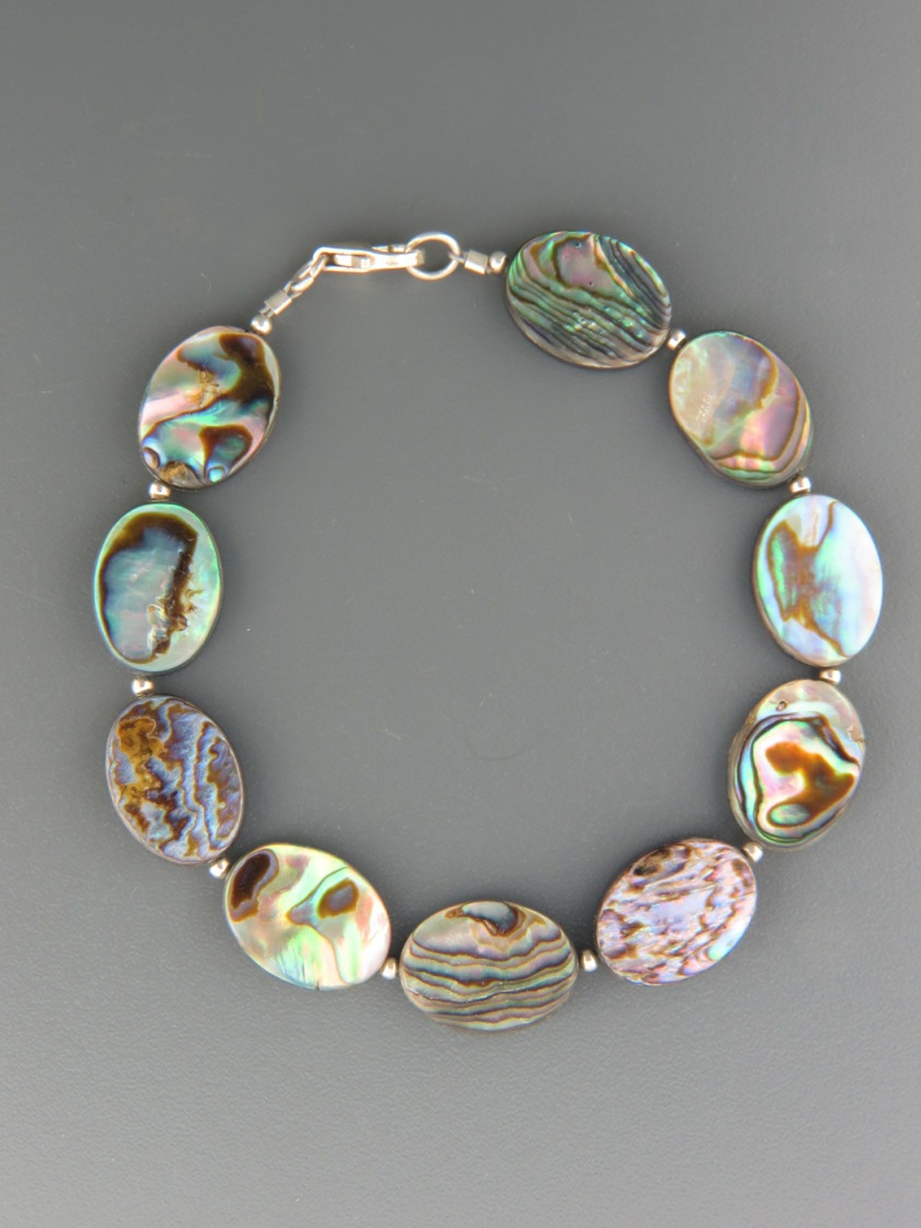 This bracelet features oval double sided New Zealand Paua Shell beads with 2mm round Sterling Silver beads.