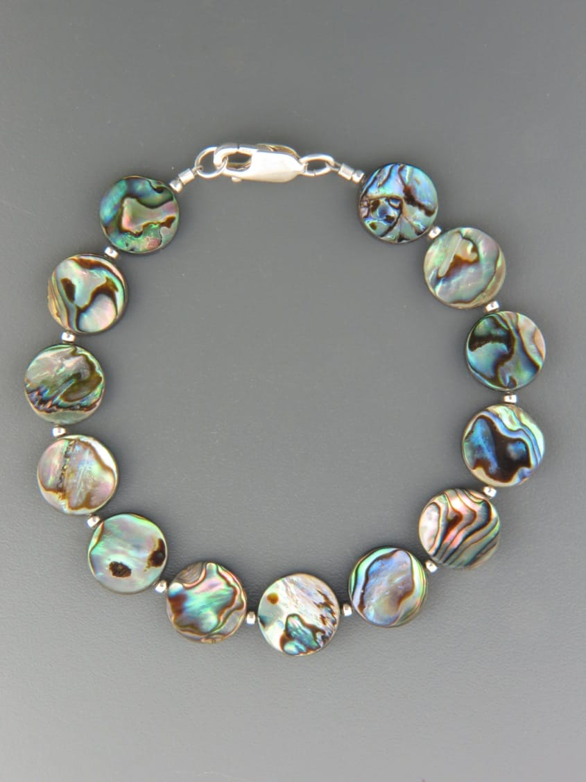 This bracelet features round double sided New Zealand Paua Shell beads with Sterling Silver beads.