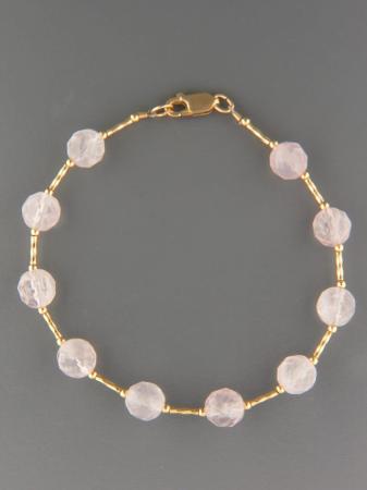 A bracelet featuring faceted round Rose Quartz stones with gold beads.