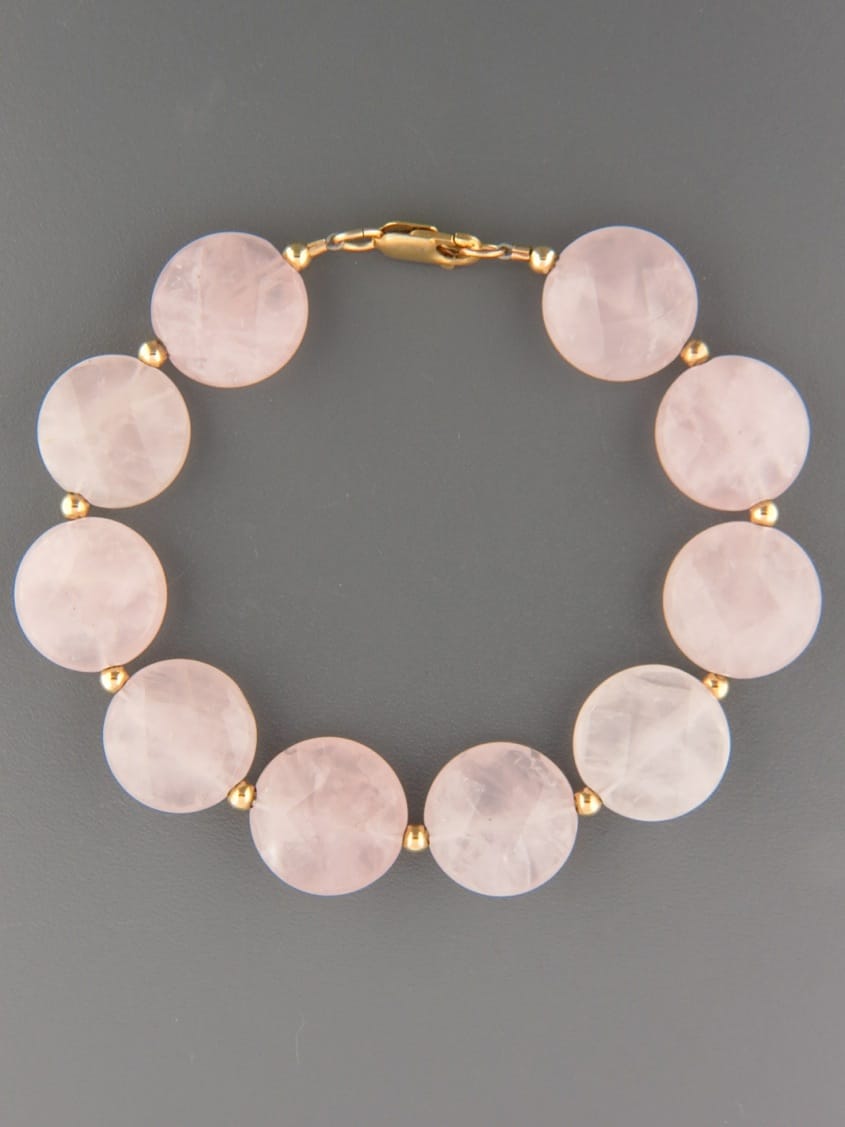 A bracelet featuring round faceted Rose Quartz stones with gold beads.