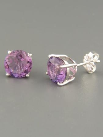 These Sterling Silver stud style earrings feature round faceted Amethyst stones.