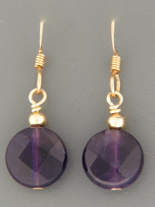 A drop style earring featuring round faceted Amethyst discs with gold beads.