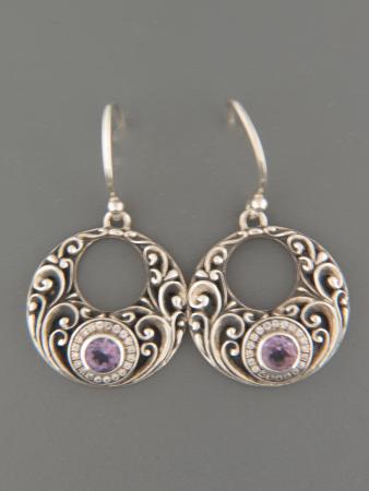 These Sterling Silver drop style earrings feature round faceted Amethyst stones with round faceted Zircon accent stones.