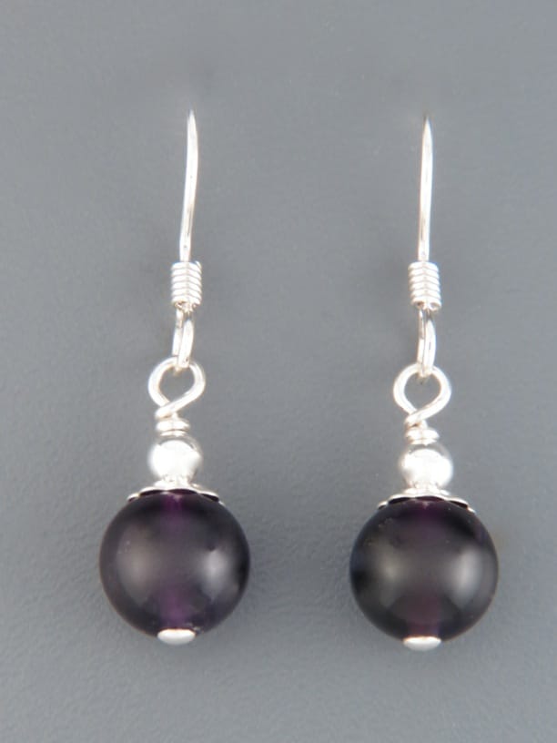 A drop style earring featuring round Amethyst stones with Sterling Silver beads.