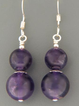 These Sterling Silver drop style earrings feature round, smooth polished Amethyst stones with Silver beads.