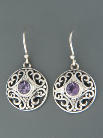 These Sterling Silver drop style earrings feature round faceted Amethyst stones.
