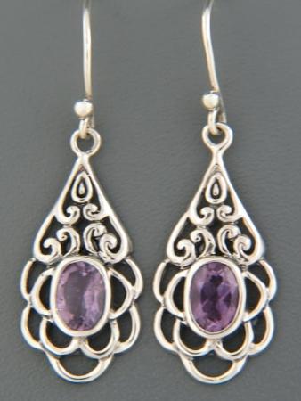 These Sterling Silver drop style earrings feature oval faceted Amethyst stones.