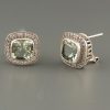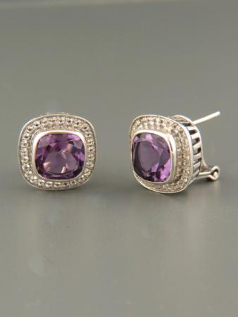 These Sterling Silver stud style earrings feature faceted, square shaped Amethyst stones with pave’ set faceted Zircon accent stones.