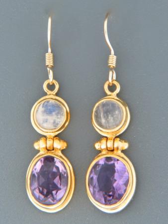 These Gold Vermeildrop style earrings feature oval faceted Amethyst stones with round Blue Moonstone cabochons.