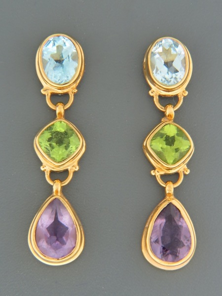 These Gold Vermeilstud style earrings feature oval faceted Blue Topaz, square faceted Peridot and teardrop faceted Amethyst stones.