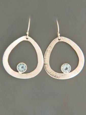 These Sterling Silver drop style earrings feature round, faceted Blue Topaz stones with a brushed Sterling Silver surround.