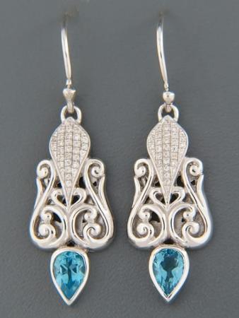 These Sterling Silver drop style earrings features teardrop faceted Blue Topaz stones with round faceted Zircon accent stones.