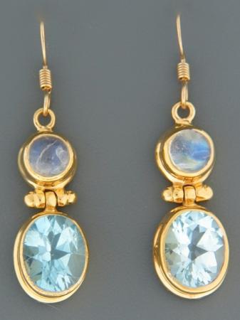 These Gold Vermeildrop style earrings feature oval faceted Blue Topaz stones with round Blue Moonstone cabochons.