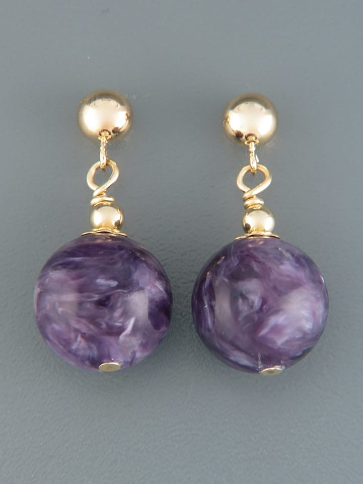 These earrings feature round Charoite stone beads with Gold stud fittings.