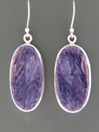 These Sterling Silver drop-style earrings feature long, oval Charoite cabochons.