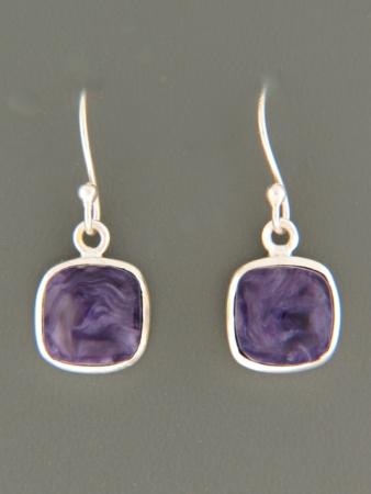 These Sterling Silver drop style earrings feature square shaped Charoite cabochons.