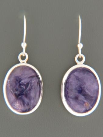These Sterling Silver drop-style earrings feature oval Charoite cabochons.