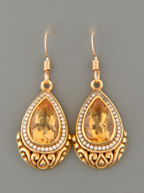 These Gold Vermeildrop style earrings feature teardrop shaped faceted Citrine stones with faceted Zircon accent stones.