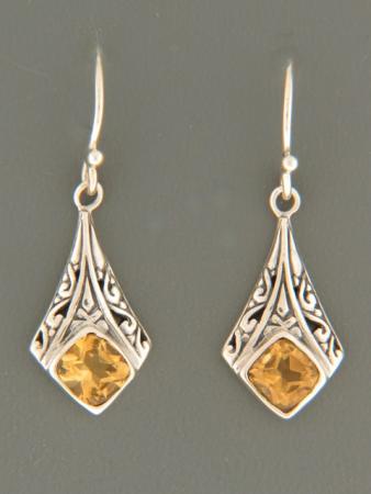 These filigreed Sterling Silver drop style earrings feature square shaped, faceted Citrine stones.