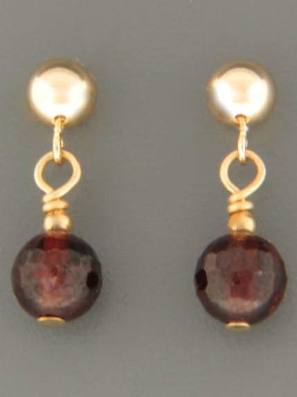 A drop style stud earring featuring round faceted Garnets with Gold beads.
