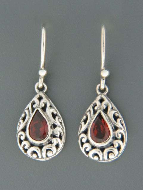 These Sterling Silver drop style earrings feature teardrop faceted Garnet stones.