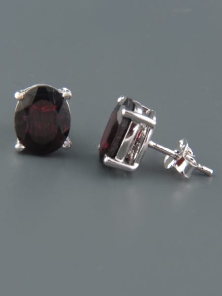 These Sterling Silver stud earrings feature oval faceted Garnet stones.