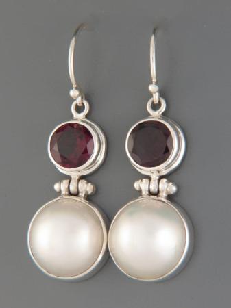 These Sterling Silver drop style earrings feature round, faceted Garnet stones with white Pacific blister Pearls.
