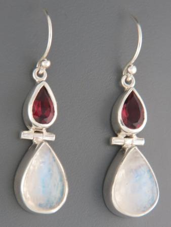 These Sterling Silver drop style earrings feature teardrop Blue Moonstone cabochons and faceted teardrop Garnet stones.