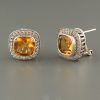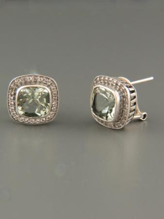 These Sterling Silver stud style earrings feature faceted, square shaped Green Amethyst (Prasiolite) stones with pave’ set faceted Zircon accent stones.