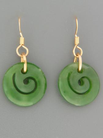 These drop style earrings feature Jade carved in a traditional New Zealand style with Gold fittings.