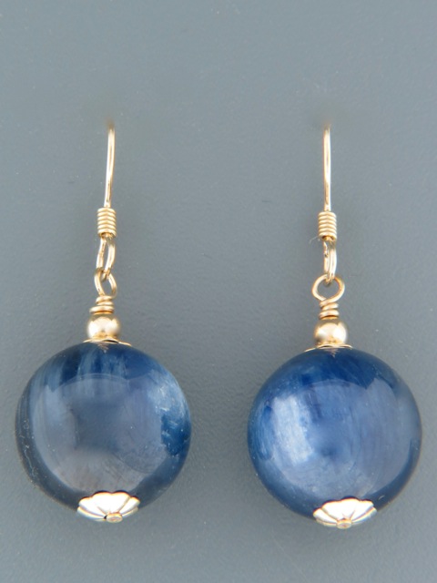 These drop style earrings feature round Kyanite stones with Gold fittings.