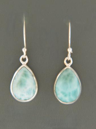 These Sterling Silver drop style earrings feature teardrop shaped Larimar cabochons.