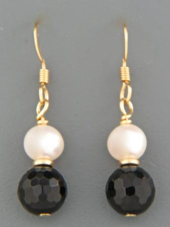 A drop style earring with round faceted Onyx stones and White Pacific Pearls and gold beads.