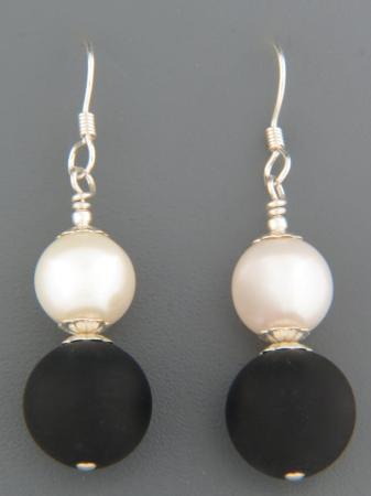These Sterling Silver drop style earrings feature matte polished Onyx stones with white Pacific Pearls.