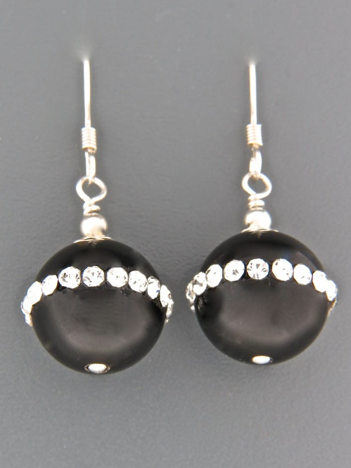 These Sterling Silver drop style earrings feature round Onyx stones inlaid with faceted Zircon stones.