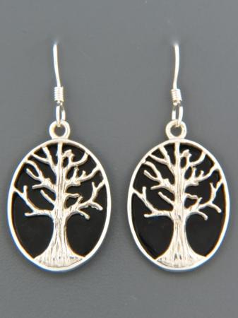 These Sterling Silver drop style earrings feature oval Black Onyx stones with a “Tree of Life” design.