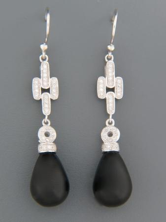 These Sterling Silver drop style earrings feature smooth polished briolette Onyx stones with round faceted Zircon accent stones.