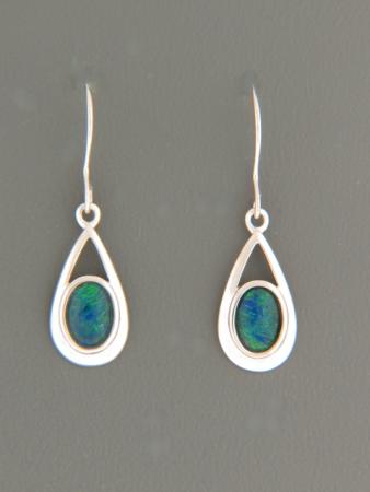 These Sterling Silver drop style earrings feature oval shaped Boulder Opal triplet cabochons with a dark blue base colour and show vibrant green opalescence.