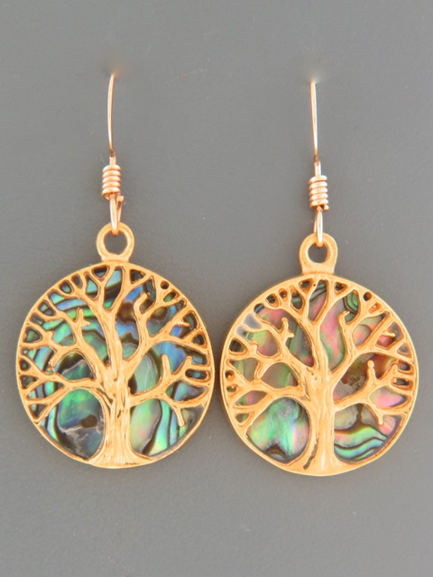 These Gold Vermeil“Tree of Life” design drop style earrings feature round New Zealand Paua Shell.