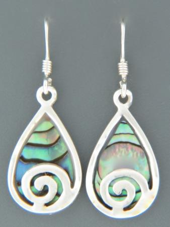 These Sterling Silver drop style earrings feature inlaid New Zealand Paua Shell with a spiral design.