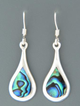 These Sterling Silver drop style earrings feature inlaid New Zealand Paua Shell in a teardrop shape.